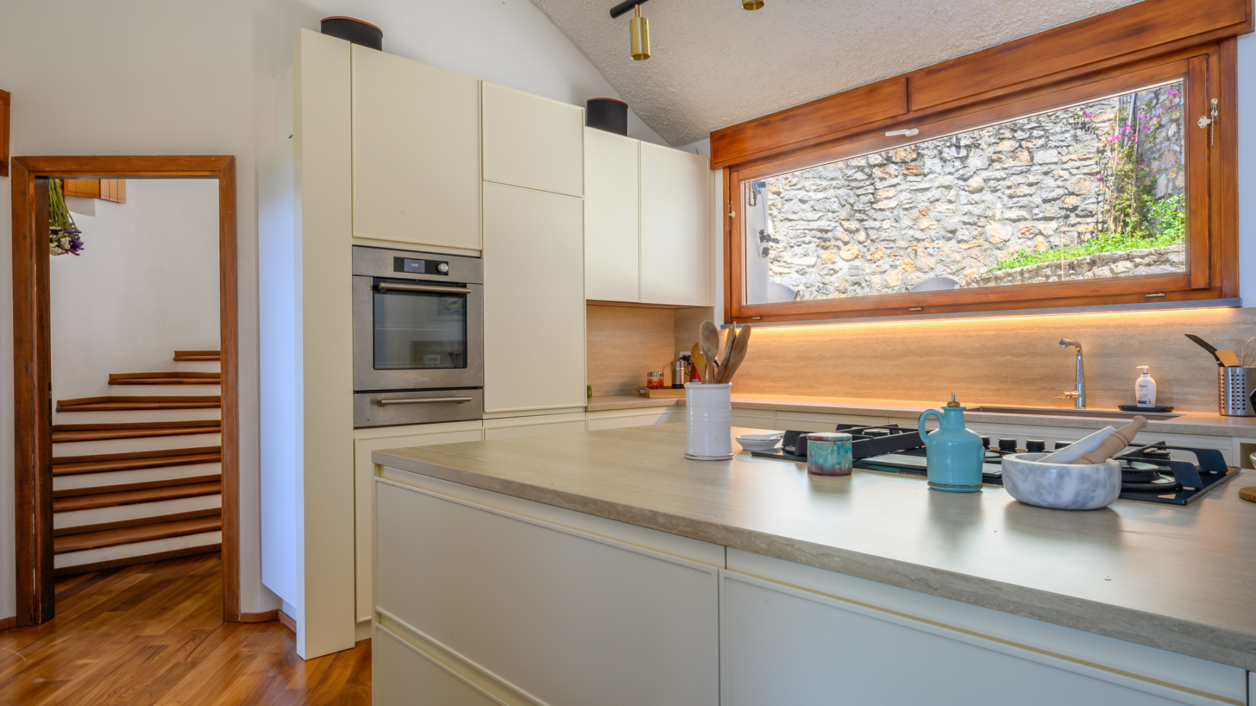 La proprietà è dotata di tutti i principali comfort, tra cui aria condizionata, riscaldamento autonomo, impianto di allarme e sistema solare/fotovoltaico. Completano la villa una dependance, una cantina, una lavanderia e diversi locali tecnici, oltre a ampi spazi esterni che includono anche un caratteristico uliveto.